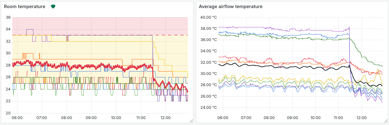 At BSC server room, we can see that we have low airflow on the top of our rack. This causes the top nodes to heat and increases our average intake temperature. It can be observed when booting the two owl1 and owl2 nodes, after a SLURM job runs: