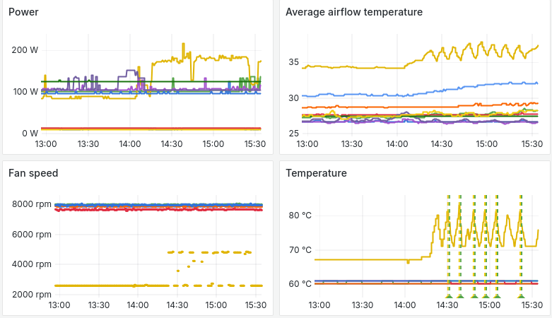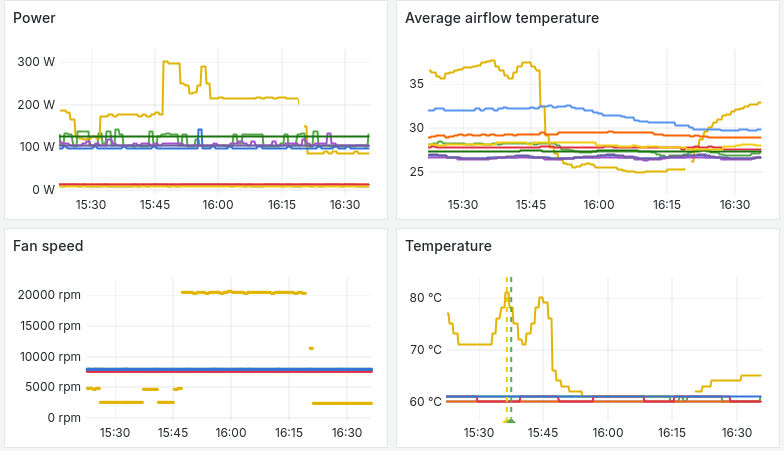 This seems to be caused by the slow speed of the fans, which tops at around 5000 RPM, instead of increasing the speed to the same level of other nodes, at around 8000 RPM (the maximum speed is 20000 RPM).