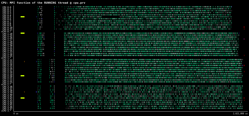 The function view attempts to provide a general overview of which are the MPI functions being executed at any point in time. The function view shows the MPI functions called by each thread (and for each CPU, the MPI functions executed by the running thread in that CPU).